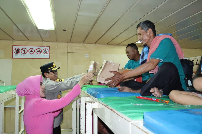 Kapolresta Palu dan Ketua Bhayangkari Bagi-Bagi Takjil Kepada Penumpang KM Labobar di Pelabuhan Pantoloan